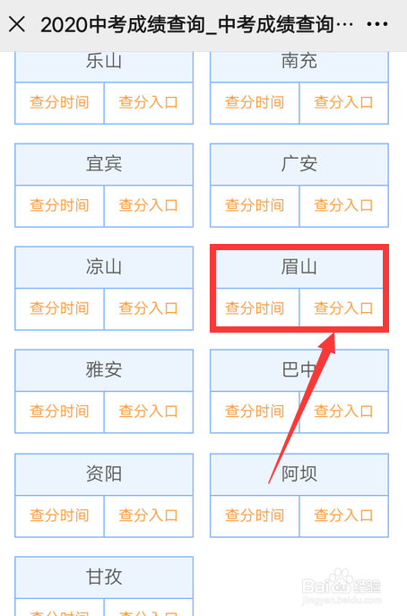 进入后找到眉山市,点击查分进口。