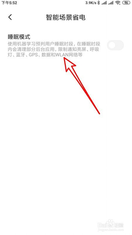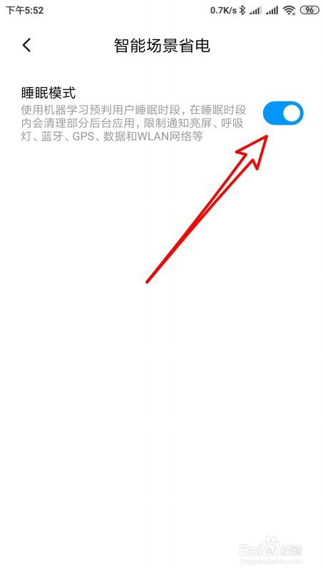 在打开的智能场景省电的设置页面中找到睡眠模式的设置项。