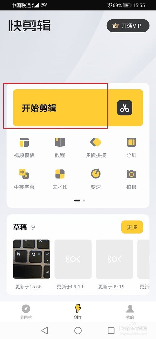 第一步打开快剪辑,进去创作界面之后,点击起头剪辑