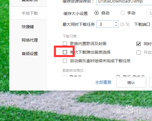 进入当地下载之后,我们可以看到右侧框架傍边有一个叫做每次下载弹出音质选择的提醒。