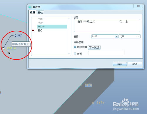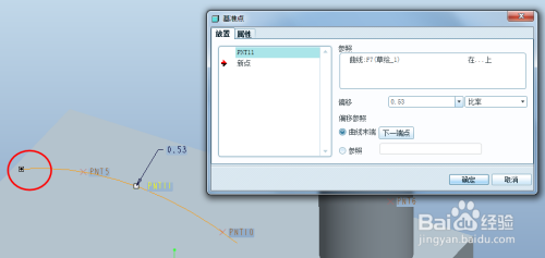 选择曲线,默认也是比率放置点,也可以切换偏移类型为实数,跟选择实体鸿沟不异的基准点建立体例。
