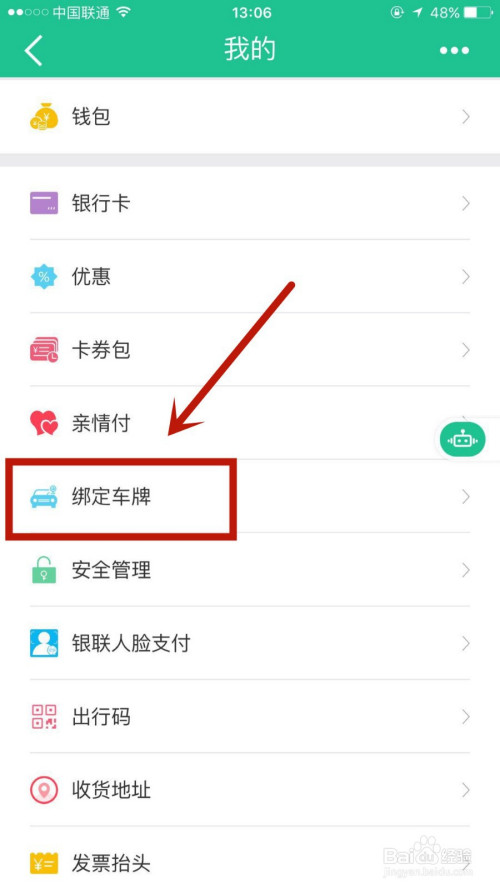 在我的页面,找到绑定车牌选项并点击进入。