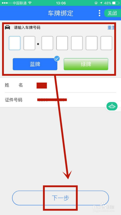编纂上本身的车辆信息,查对姓名跟身份证号后点击下一步即可。