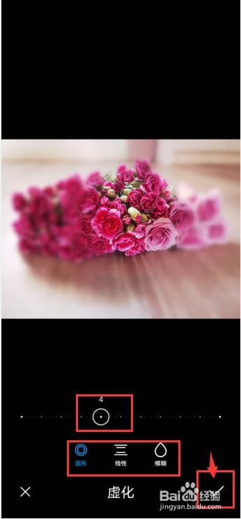 5、按照需求可以点击选择虚化的外形和强度,按住屏幕可以拖动虚化的位置。调整到合适的结果后,点击右下角【√】。