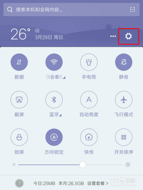 用食指从手机屏幕顶部往下滑,接着点击右上角的“设置”按钮