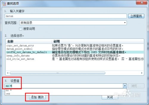 直接在查找选项对话框,就可以选中搜刮中需要的选项,然后选择设置值(星号暗示默认值),点击添加,就插手到选项中了,若是已有的就不是添加而是更改。