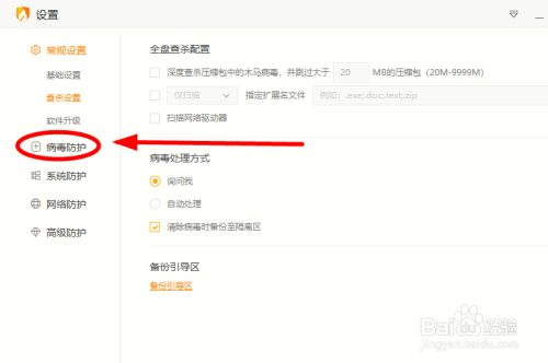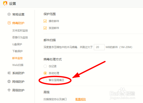 在右侧【病毒处置体例】窗口,默认勾选【备份至隔离区】选项,单击去失落勾选即可