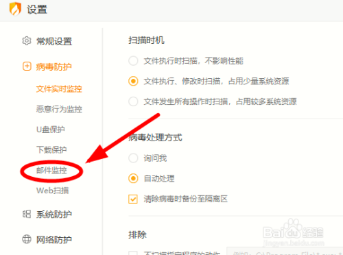 点选【病毒防护】下的【邮件监控】选项