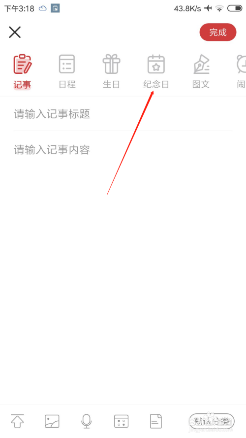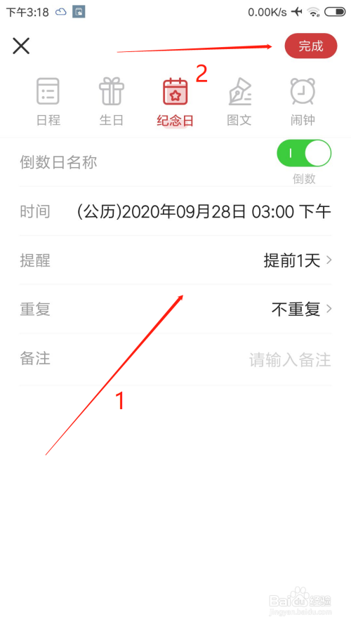 4.选择纪念日当天的日期,提前几天提醒,是否反复,然后点击完当作即可