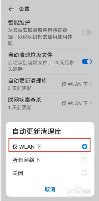 点击后可以看到默认是【仅WLAN下】主动更新。