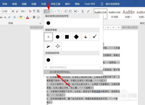 点击项目符号旁边的下拉箭头。点击界说新项目符号。