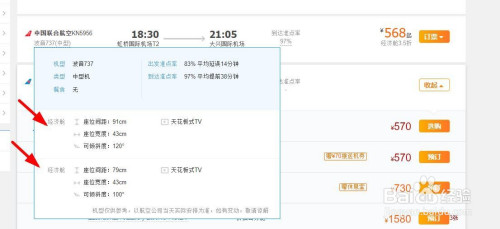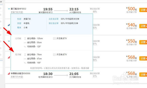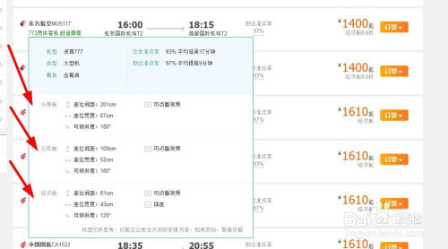 将鼠标移动到其他班次的机型上,可以看到有的飞机只有经济舱,申明该飞机只供给经济舱;有的飞机有公事舱和经济舱,所以这个机型就供给公事舱和经济舱办事。这些飞机大多是小型机或中型机。所以这些航程同样是预定不到甲等舱的。