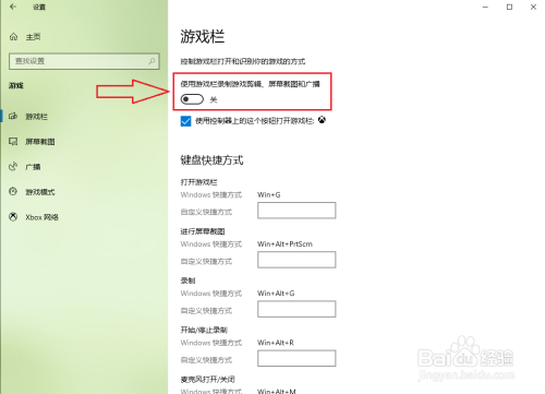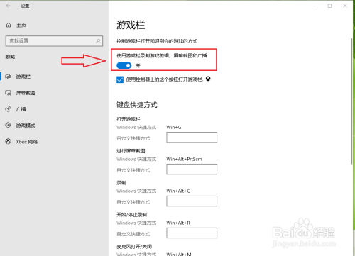 点击“利用游戏栏录制游戏剪辑、屏幕截图和广播”下面的开关。