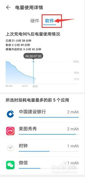 点击上方【软件】可以看到手机安装软件的电量利用环境。