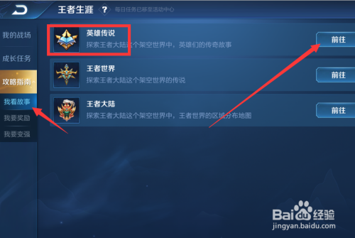 2、选择攻略指南,在我看故事里选择英雄传说。