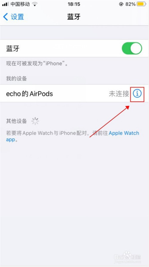 找到AirPods设备,并点击其最后面的近似倒感慨号的图标。