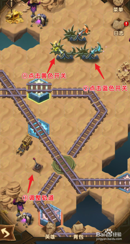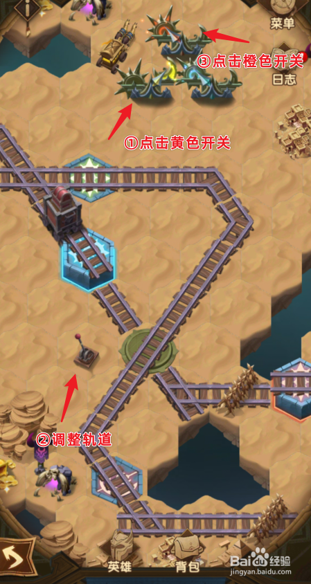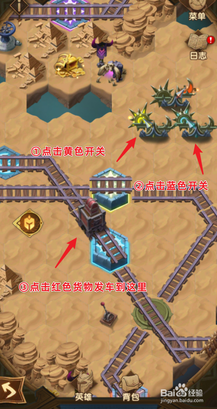 接下来,点击黄色的开关,然后点击蓝色的开关,将红色的货色发车,堵住这里的道路。