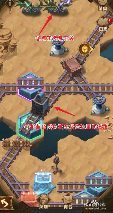 点击蓝色货色发车后,将其堵住下方的道路。之后,点击紫色的开关。