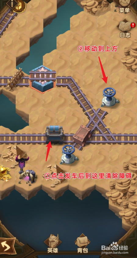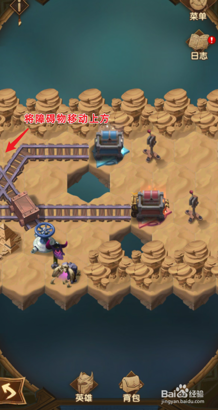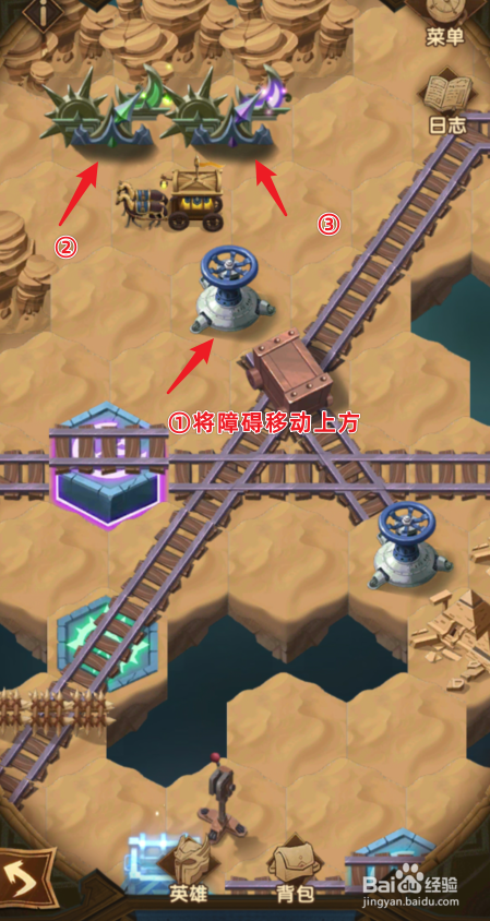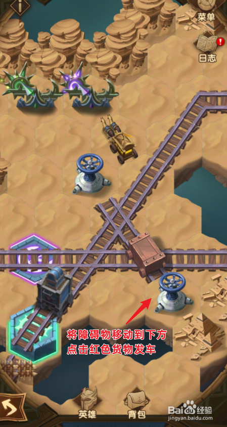 之后,点击将蓝色的货色发车,断根路上的障碍。之后,将障碍移动到上方的位置。