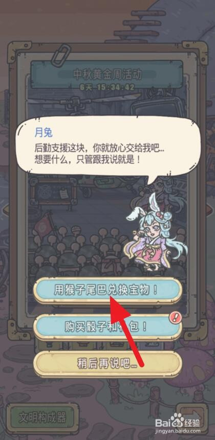 进入中秋黄金周活动页面,点击【月兔】,选择【用山公从头至尾巴兑换宝贝】。