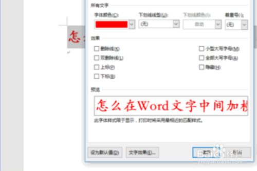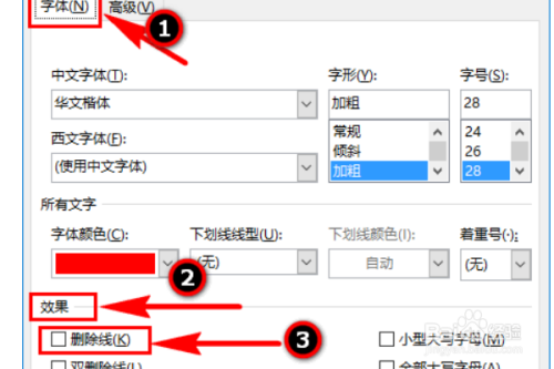 选中对话框中“字体”,然后在“结果”处找到“删除线”。
