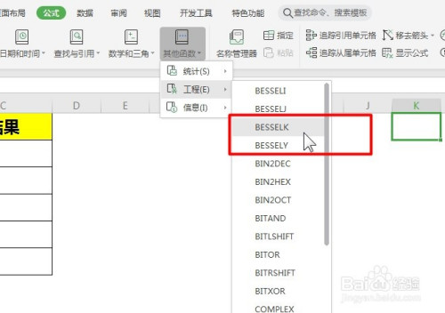 然后在工程函数下拉列表中点击“BESSELK”函数,打开函数参数对话框