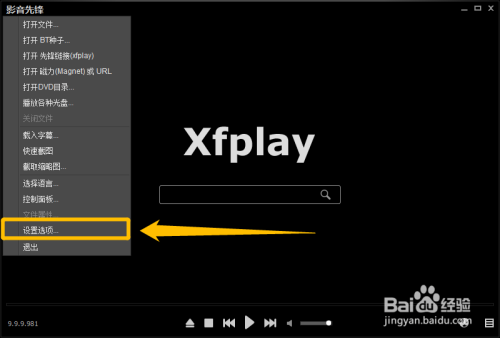 点击左上方的“影音前锋”按钮后,在睁开的下拉框中选择“设置选项...”