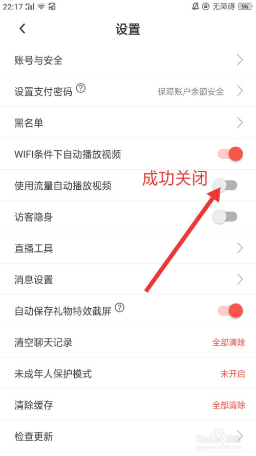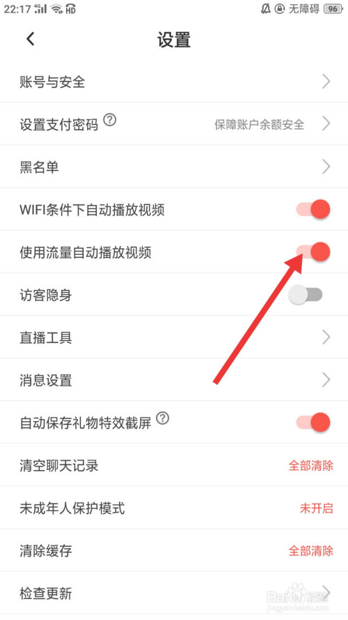 进入到设置界面后,我们再滑动利用流量主动播放视频后面的滑块至灰色。