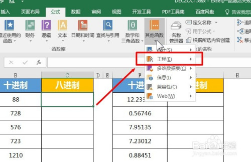 点击“公式-其他函数-工程”,打开函数下拉列表