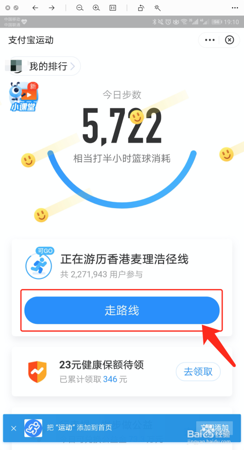 在【支付宝活动】中,点击【走路线】,如下图所示。