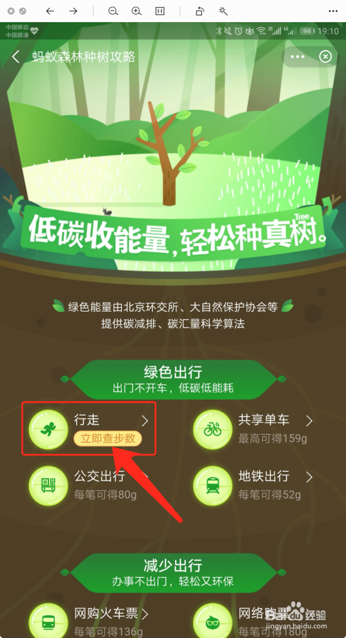 在【蚂蚁丛林种树攻略】中,点击【行走】,如下图所示。