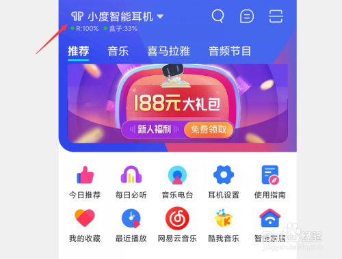 进入软件首页之后点击上方绑定的小度智能耳机。