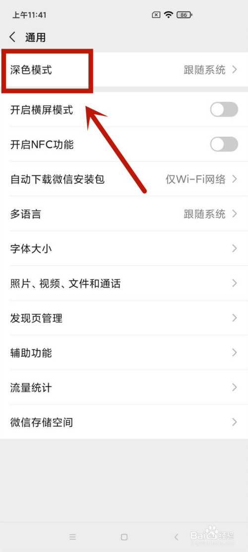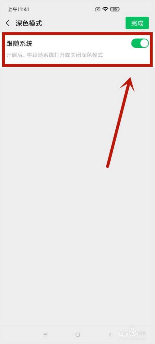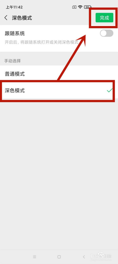 3.将跟从系统后的按钮封闭,勾上深色模式后点击完当作。