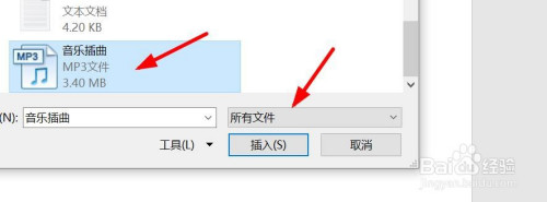 在电脑中选择一个MP3音乐文件,点击插入。