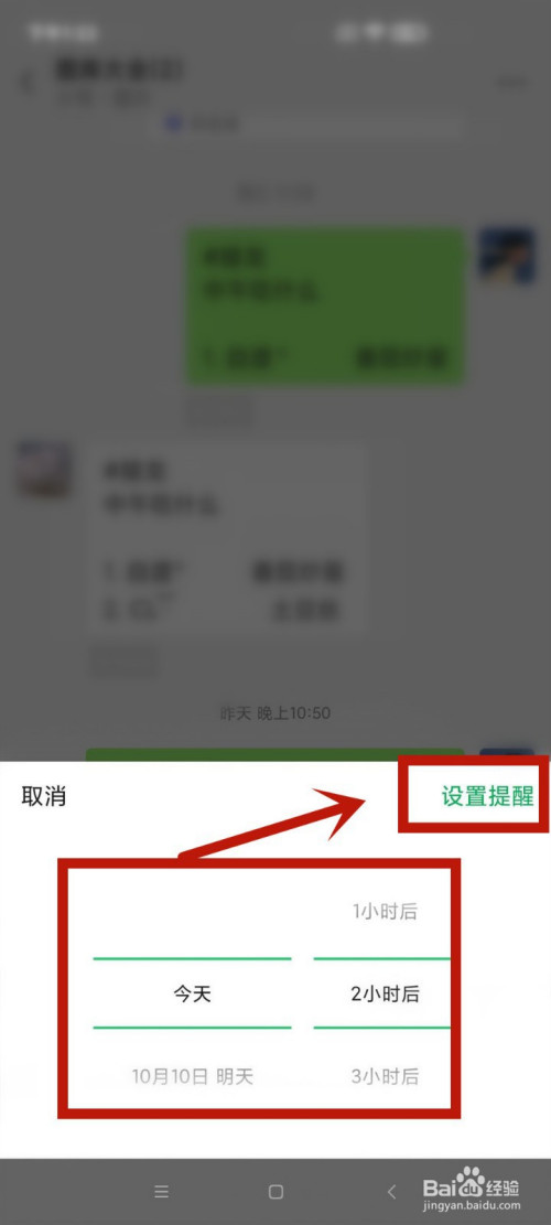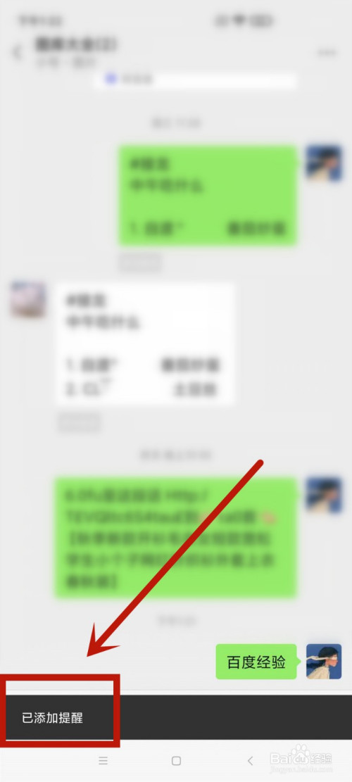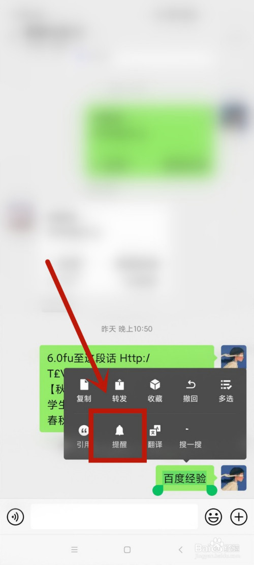 2.长按需操作的聊天内容,在东西栏中点击提醒。