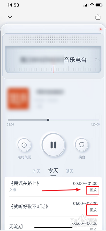 打开电台后,您也可以点击收听【回放】、【换台】等功能哦!