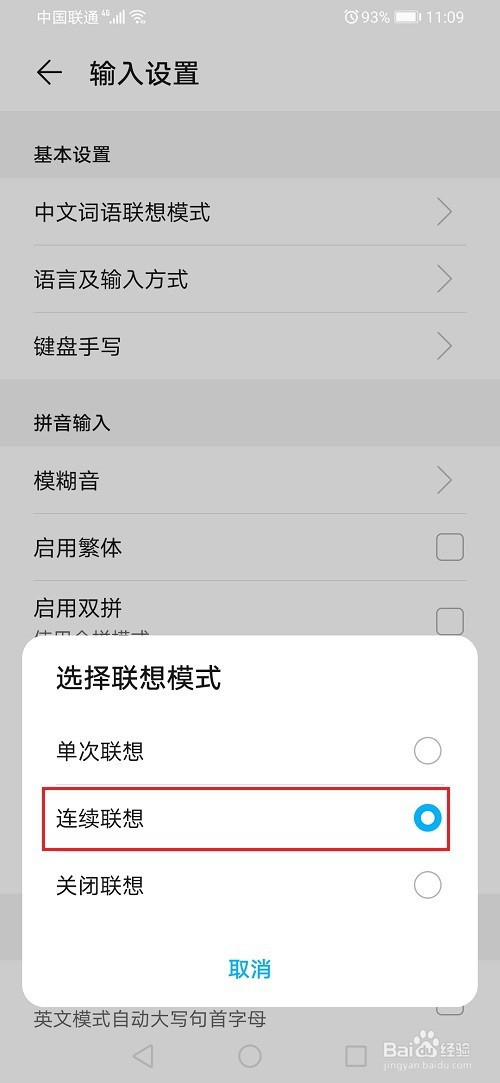 第五步选择持续联想,就开启华为手机输入法联想功能了,按照需要设置