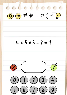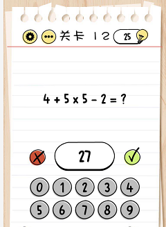 脑力测试过关攻略关卡12:4+5×5-2=?谜底【27】;攻略:这是简单的运算,需要注重看清标题问题,中心是5×5=25,要先算乘法,然后计较4+25-2=27。