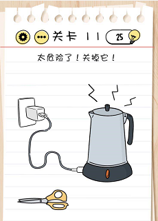 脑力测试过关攻略关卡11:太危险了!关失落它!谜底攻略:注重不雅察图片,热水壶的底座是有开关的,点击底座上的橘色开关就可以关失落热水壶。铰剪是误导项。