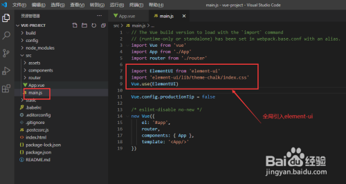 打开src/main.js,经由过程import引入element-ui组件及样式文件,并添加到全局Vue实例中,如下图所示: