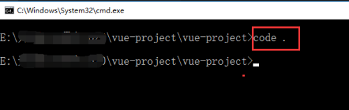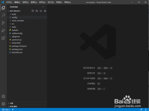 我们在号令行中输入code . 来利用Visual Studio Code打开该vue项目,如下图所示: