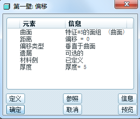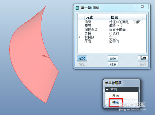 选择曲面后,顿时弹出输入栏,这个尺寸注重不是偏移壁厚,而是从曲面偏移出来的距离,一般我们输入0,因为曲面建立可能参考内侧或者外侧尺寸。若是偏移需要输入数值,注重红色箭头,不异偏向输入正值,反偏向输入负值。