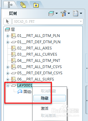还可以直接在模子树选中曲面特征,右键快捷菜单中选择埋没。