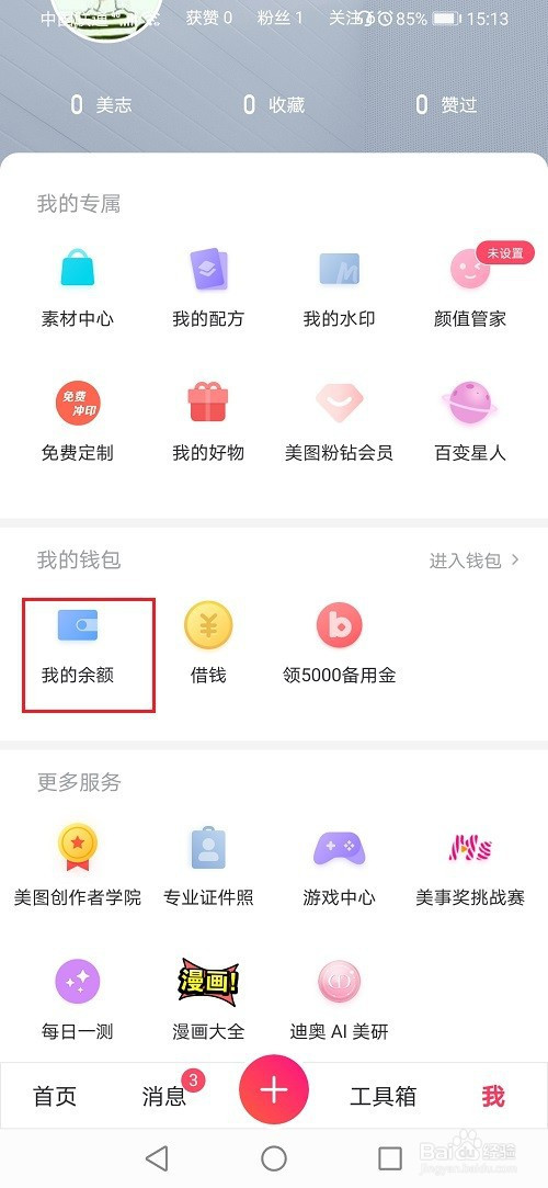 第二步进去美图秀秀我的界面之后,点击我的余额