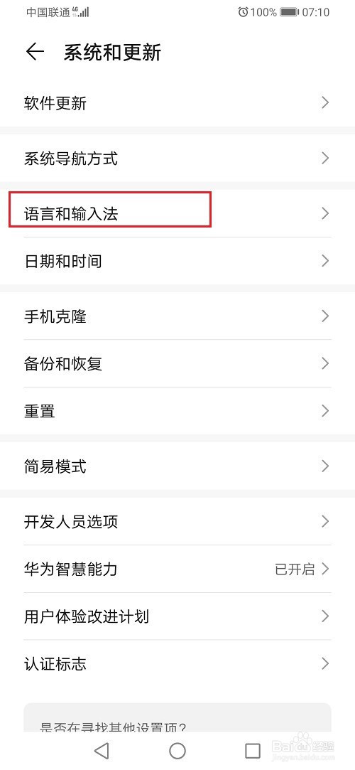第三步进去系统和更新之后,点击说话和输入法->百度输入法华为版