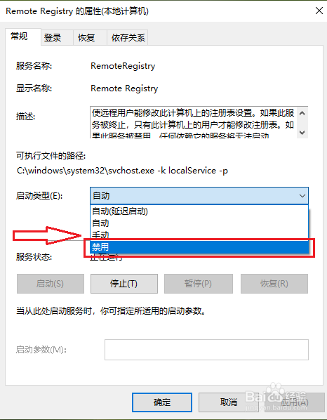 点击“启动类型”右侧的下拉列表框,选择“禁用”选项。