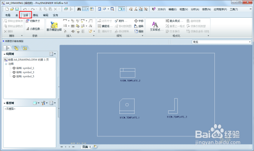 我们还可以在格局中设置默认字体,首先在工程图页面,将“结构”选项卡切换到“注释”。