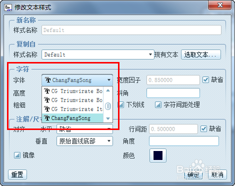 这里已经显示默认字体是“ChangFangSong”,是因为我前面已经经由过程画图选项完当作了设置。若是您之前没设置,这是您就可以鄙人拉列表中选择字体库中的字体文件了。设置好字体,记得保留工程图模板文件。