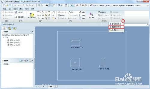 打开工程图模板文件设置字体,工程图模板文件位置:C:\ptc\proeWildfire5\templates 。安装的proe版本分歧,路径不全数不异,但都是在proe安装目次下的templates目次。