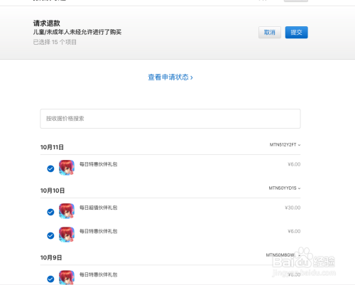 点击请求退条目,选好退条目原因,选择需要申请退条目的账单,点击提交